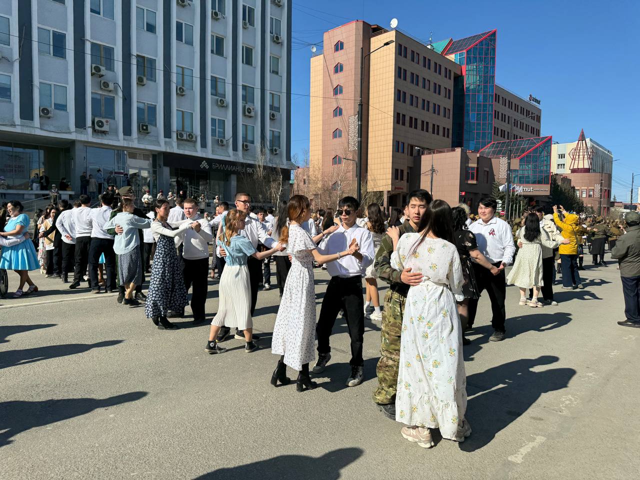 Активисты и молодежь Якутского РО ЛДПР приняли активное участие в общероссийской акции "Вальс Победы". В этом году знаковое мероприятие развернулось на главной артерии Якутска - проспекте Ленина, где около 5 тысяч пар закружились в танце. Мужчины предстали в стилизованной военной форме времен Второй мировой войны, щеголяя обмундированием, а некоторые даже украсили себя медалями, фуражками, солдатскими ремнями и сапогами – все в точности, как в суровые военные годы. Девушки также частично облачились в военную форму, но многие выбрали наряды, полные жизни и красок: пестрые платья в цветочек или горошек. Их прически украшали шелковые ленты, волосы были заплетены в косы или собраны в хвостики, а на ногах красовались белые носочки и изящные туфли, хотя некоторые предпочли сапожки.